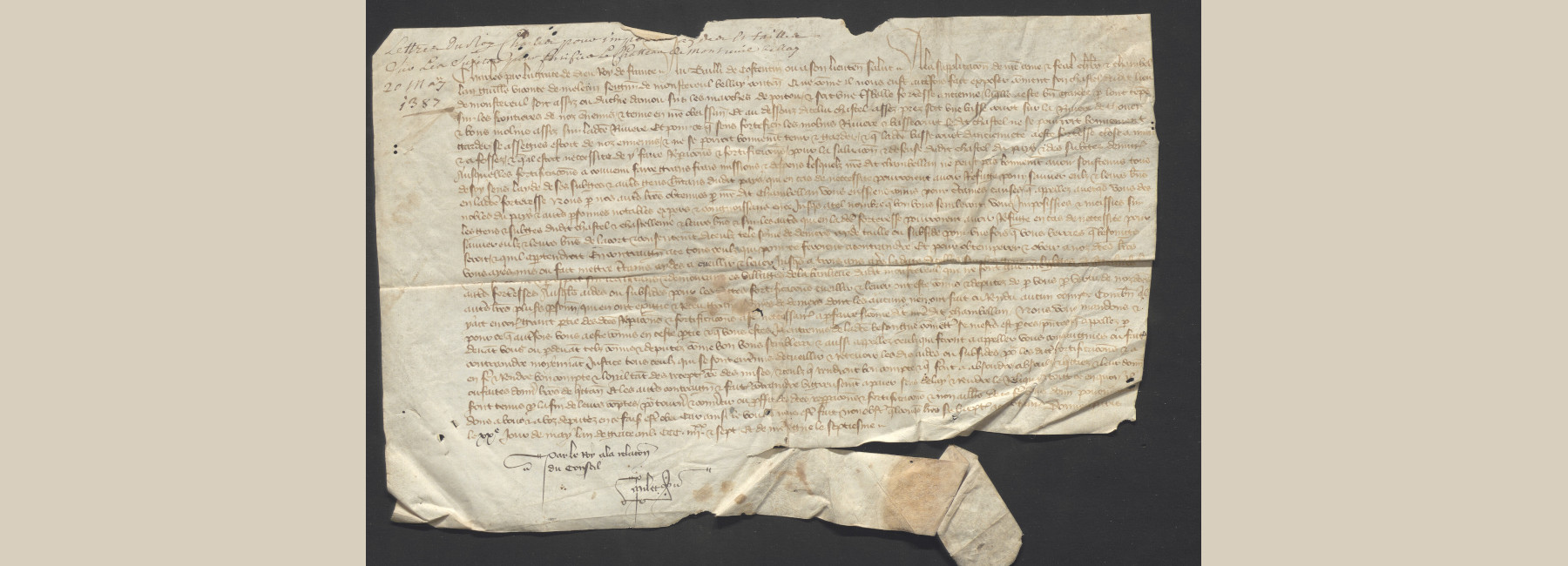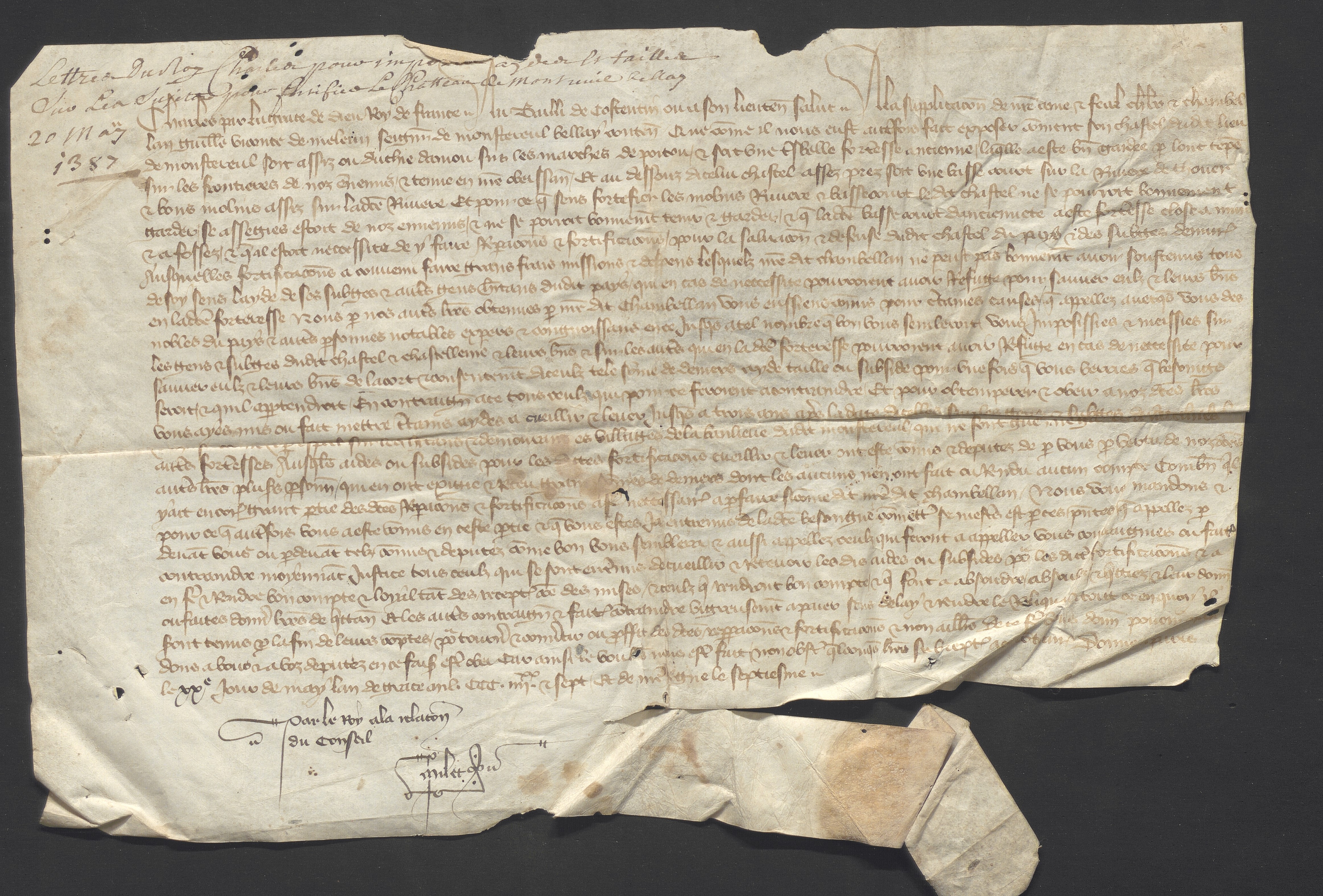 Charles par la grace de Dieu roy de France. Au bailli de Costentin (a) ou à son lieutenant salut. À la supplication de notre amé et féal chevalier et chambel-[2]-lan Guillaume vicomte de Meleun seigneur de Monstereul Bellay contenant que comme il nous eust autrefois fait exposer comment son chastel dudit lieu [3] de Monstereul soit assiz ou duchié d’Aniou sur les marches de Poitou, et soit une très belle forteresse ancienne, laquelle a esté bien gardée par lont temps [4] sur les frontières de nos ennemis, et tenue en notre obéissance. Et au dessouz d’icelui chastel assez prez soit une basse court sur la rivière de Thouer [5] et bons molins assiz sur la dicte rivière. Et pour ce que sens fortefier les molins rivière et basse court le dit chastel ne se pourroit bonnement [6] garder. Se assiégés estoit de noz ennemis, et ne se pourroit bonnement tenir et garder, et que la dicte basse court d’ancienneté a esté forteresse close à murs [7] et à fossez et que al (b) estoit nécessité de y faire réparacions et fortificacions, pour la salvacion et défense dudit chastel du pays et des subgés demurans [8] ausquelles fortificacions a convenu faire grans frais missions et despens lesquelz notre dit chambellan ne peust pas bonnement avoir soustenus tous [9] de soy sens l’ayde de ses subgés et autres gens habitans dudit pays, qui en cas de néccessité pourroient avoir refuge pour sauver eulz et leurs biens [10] en la dicte forteresse nous par noz autres lettres obtenues par notre dit chambellan vous eussiens commis pour certaines causes que appelez avecques vous des [11] nobles du pays et autres personnes notables expers et congnoissans en ce jusques à tel nombre que bon vous semberoit, vous imposissiés et meissiés sur [12] les gens et subgés dudit chastel et chastellenie et leurs biens et sur les autres qui en la dicte forteresse pourroient avoir refuge en cas de néccessité pour [13] sauver eulz et leurs biens de l’acort et consentement d’iceulz tele somme de deniers ayde taille ou subside pour une fois que vous verriés que besoings [14] seroit, et qu’il appartendroit (c). En contraignant à ce tous ceulz qui pour ce seroient à contraindre. Et pour optempérer et obéir à noz dictes lettres [15] vous ayés mis ou fait mettre certains aydes à cueillir et lever jusques à trois ans après la date d’icelles sur les gens et subgés dudit chastel [16] et chastellenie et par especial sur les habitants et demourant ès villages de la banlieue dudit Monstereul qui ne font gués ne gardes à aucunes [17] autres forteresses ausquelles aides ou subsides pour les dites fortificacions cueillir et lever ont esté commis et députez de par vous par vertus de noz dictes [18] autres lettres plusieurs personnes, qui en ont exigié et receu grans sommes de deniers dont les aucuns n’en ont fait ou rendu aucun compte combien qu’il [19] y ait encore grant partie des dictes réparacions et fortificacions à faire (d) néccessaires à parfaire si comme dit notre dit chambellan. Nous vous mandons et [20] pour ce que autrefois vous a esté commis en ceste partie et que vous estes ja entremis de la dicte besongne commettons se mestiers est par ces présentes que appelez par [21] devant vous ou par devant telz commis et députez comme bon vous semblera et aussi appellez ceulz qui seront à appeller contraigniés ou faites [22] contraindre moyennant justice tous ceulz qui se sont entremis de cueillir et recevoir les dis aides ou subsides pour les dictes fortificacions et à [23] en faire et rendre bon compte et loyal tant des receptes comme des mises, et ceulz qui rendront bon compte, et qui seront à absoudre, absoulez, et quictiez, et leur donner [24] ou faites donner lettres de quittance. Et les autres contraigniés et faites contraindre vigreusement à paier sens délay et rendre le reliqua et tout ce en quoy il [25] seront tenus par la fin de leurs comptes, pour tourner et convertir ou proffit des dictes répparacions (e) et fortificacions et non ailleurs de ce faire vous donnons povoir man-[26]-dons à vous et à vos députez en ce faisant estre obéi car ainsi le voulons (f) nous estre fait, nonobstant quelconques lettre subreptices à ce contrans. Donné à Paris [27] le XXe (g) jour de may l’an de grace mil CCC IIIIxx, et sept. Et de notre règne le septiesme. [28] Par le roy à la relacion [29] du conseil [30] Milet (h).