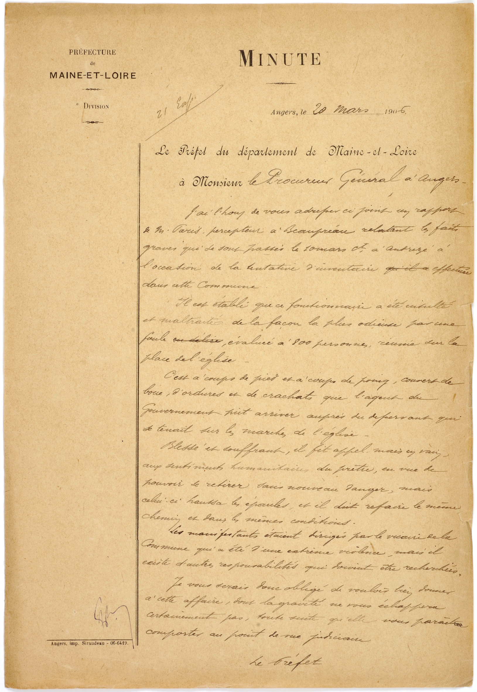 Depuis 1901, les lois anticléricales se sont durcies laissant la place à la laïcisation, sous la plume des gouvernements successifs d’Emile Combes, de Paul Rouvier et d’Aristide Briand. La loi votée à la chambre des députés le 9 décembre 1905 ravive des souvenirs et des antagonismes douloureux, dans tout l’Ouest de la France et notamment au cœur de la Vendée angevine, dans les Mauges, lorsque les premières circulaires demandent aux fonctionnaires chargés d’effectuer les inventaires « l’ouverture des tabernacles ». Si la majorité des catholiques acceptent la loi de Séparation, ils refusent qu’on pille leurs églises et parlent de profanation et d’atteinte à la propriété privée.