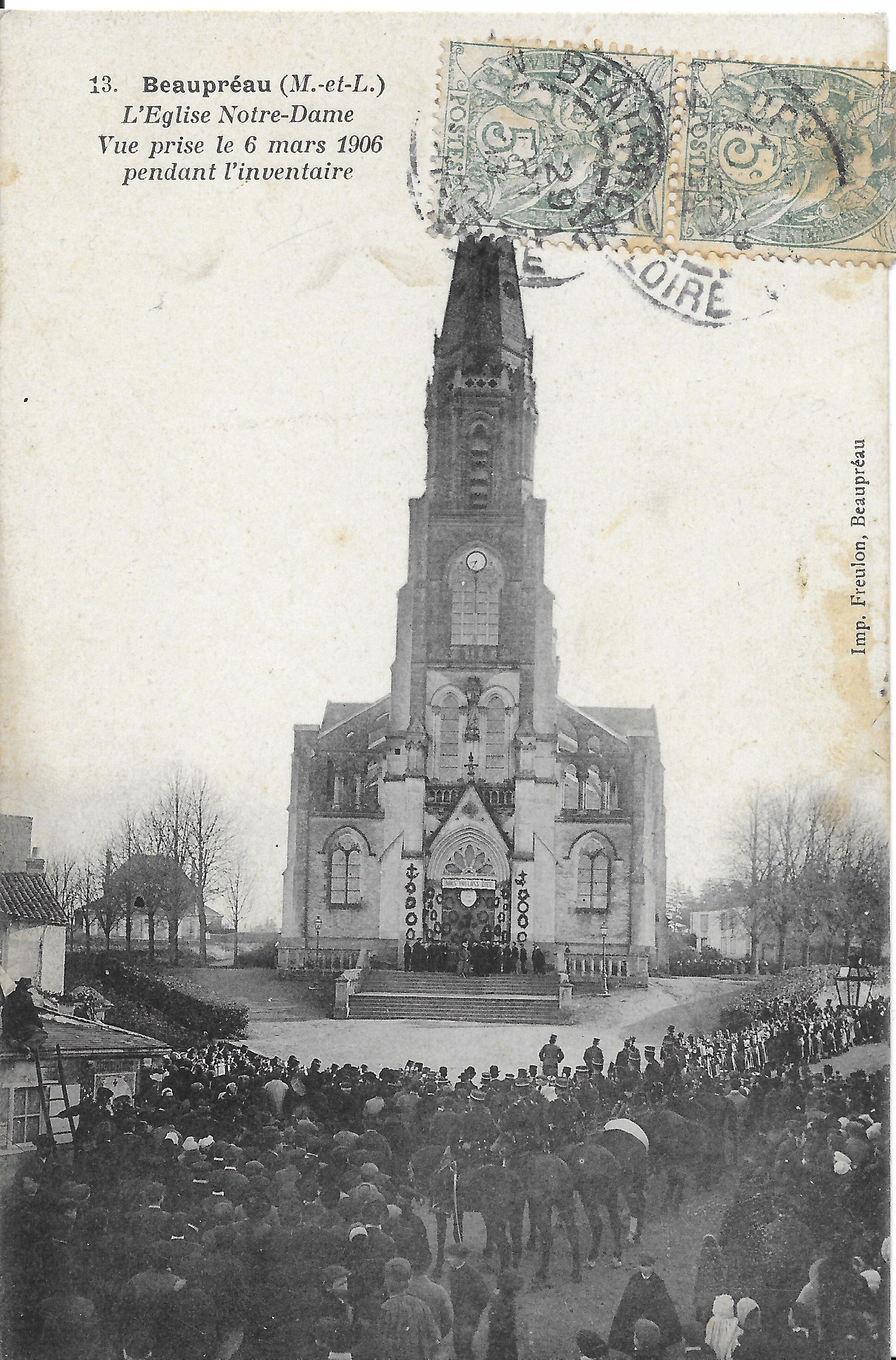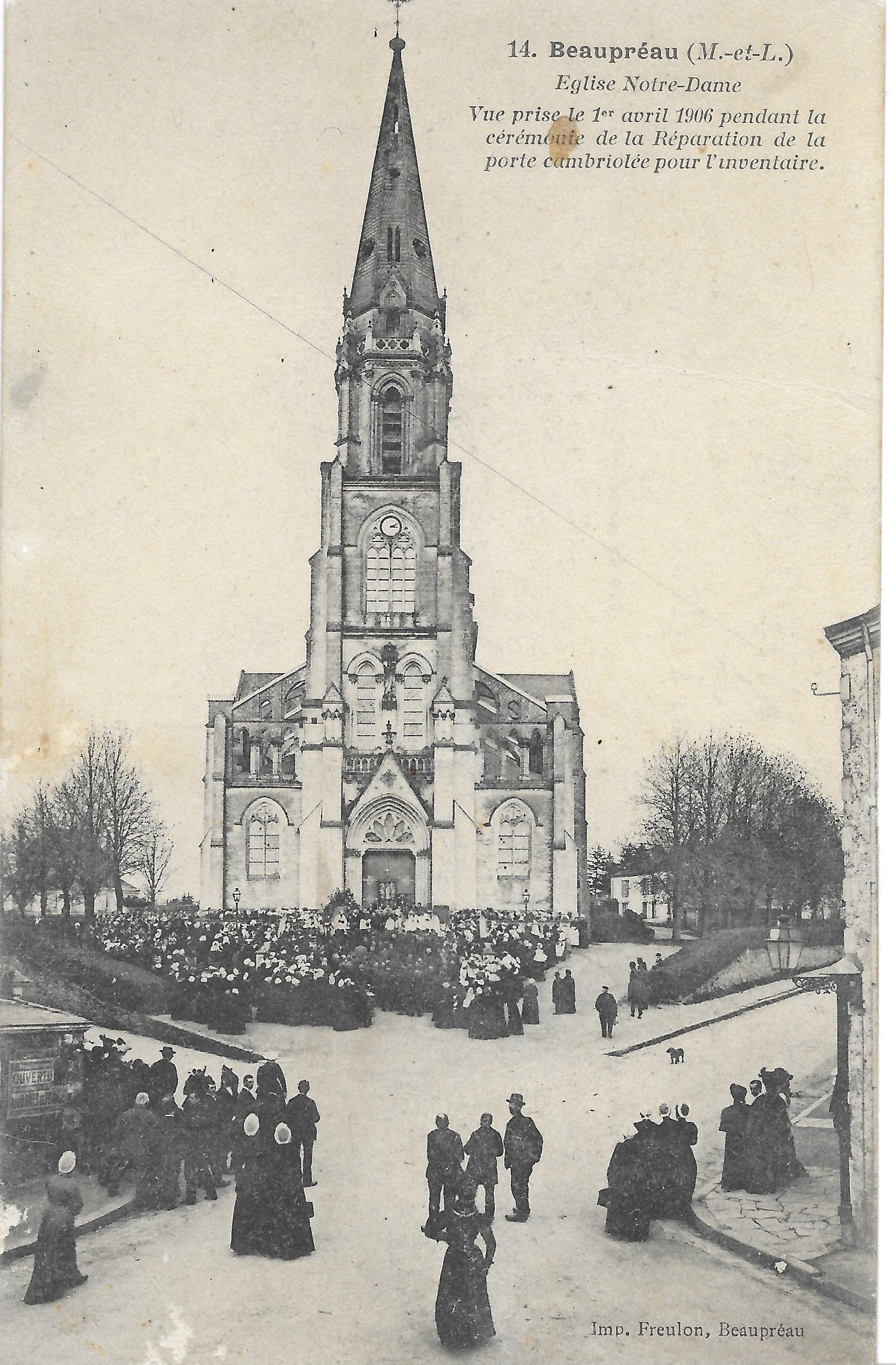 Le 6 mars 1906, les deux églises de Beaupréau vivent un véritable état de siège. Le recensement est « épique » avec des affrontements que la presse de l’époque ne manque pas de relater. Déterminés et galvanisés par les hommes politiques de l’arrondissement, notamment le duc de Blacas, maire, conseiller général et futur député de la circonscription, les paroissiens des deux églises de Beaupréau attendent de pied ferme et sous les huées les agents de l’État préposés à l’inventaire des ciboires, calices et autres objets du culte. Il faut préciser qu’une première tentative avait avortée, fin janvier, les receveurs de l’Enregistrement n’avaient pas trouvé de témoins pour les assister. Celui du percepteur s’était fait porter pâle et sa femme avait prévenu le maire et les curés de l’heure des inventaires. Ils sont, cette fois, accompagnés d’un bataillon du 77e d’infanterie de Cholet, arrivé dans la nuit du lundi au mardi 6 mars 1906 pour prendre position et les aider à exécuter leurs tâches. Mais le tocsin a alerté la population aux premiers mouvements de la troupe et des centaines de fidèles bloquent les accès tandis que d’autres s’enferment dans les deux églises. « À Notre-Dame, il a fallu plus d’une heure et demie aux sapeurs pour faire sauter la porte de la sacristie. À Saint-Martin, sept sapeurs du 77e ont également travaillé plus d’une heure pour enfoncer les portes car les haches s’émoussaient sur l’acier des barricades. Là, comme à Notre-Dame, après lecture des protestations de MM. les curés et de M. le duc de Blacas, un simulacre d’inventaire a pu avoir lieu au milieu des chants religieux. L’agent du fisc avait amené deux témoins de Cholet pour accomplir sa triste besogne » rapporte L’Intérêt Public du 11 mars 1906.