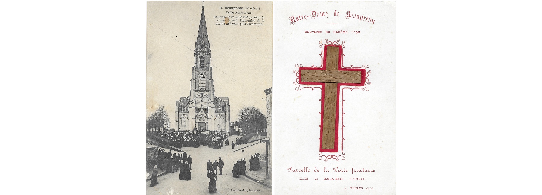 C’était il y a 120 ans. Les Lois de séparation des Églises et de l’État allaient marquer un tournant dans les relations entre l’Église catholique et le pouvoir politique, avec des ondes de choc jusque dans les Mauges et à Beaupréau. En ce tout début du XXe siècle, la vie dans les campagnes des Mauges est encore marquée par le poids de la religion et des pratiques traditionnelles. L’Église et ses rites ancestraux, les messes dominicales, le calendrier des fêtes religieuses en l’honneur de la Vierge et des saints, les baptêmes, les mariages et les enterrements rythment le quotidien des habitants des villes et des villages que le clocher égrène, comme le chapelet du temps qui passe, entre les matines et les angélus. L’immuable campagne des tableaux de Millet demeure, vouée au catholicisme et aux travaux des champs, dans l’immensité de paysages crépusculaires.