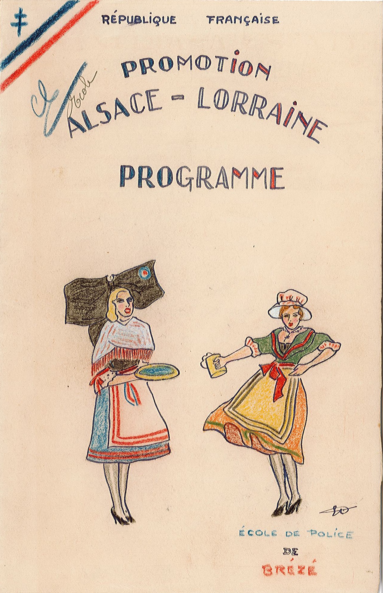Ce document m’a interpelée car il tranche au milieu des documents purement administratifs qui relatent le fonctionnement de l’école régionale de police de Brézé. Réalisé avec les moyens du bord, sans doute par un élève ou un encadrant, il reprend tous les codes de l’iconographie patriotique, avec ses couleurs bleu-blanc-rouge et ses costumes régionaux des provinces perdues érigés en emblèmes politiques.
