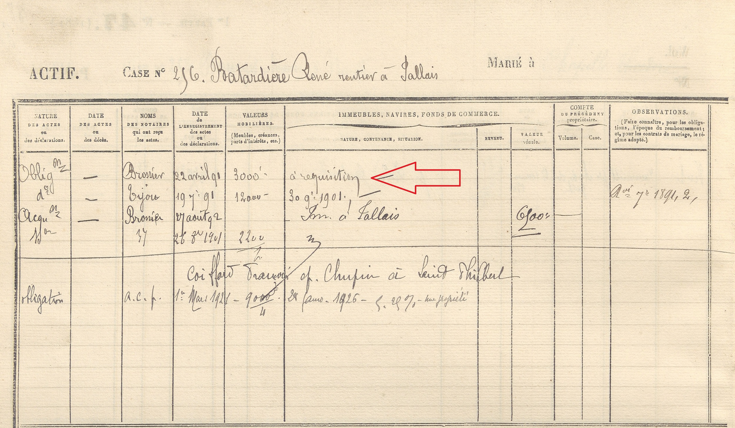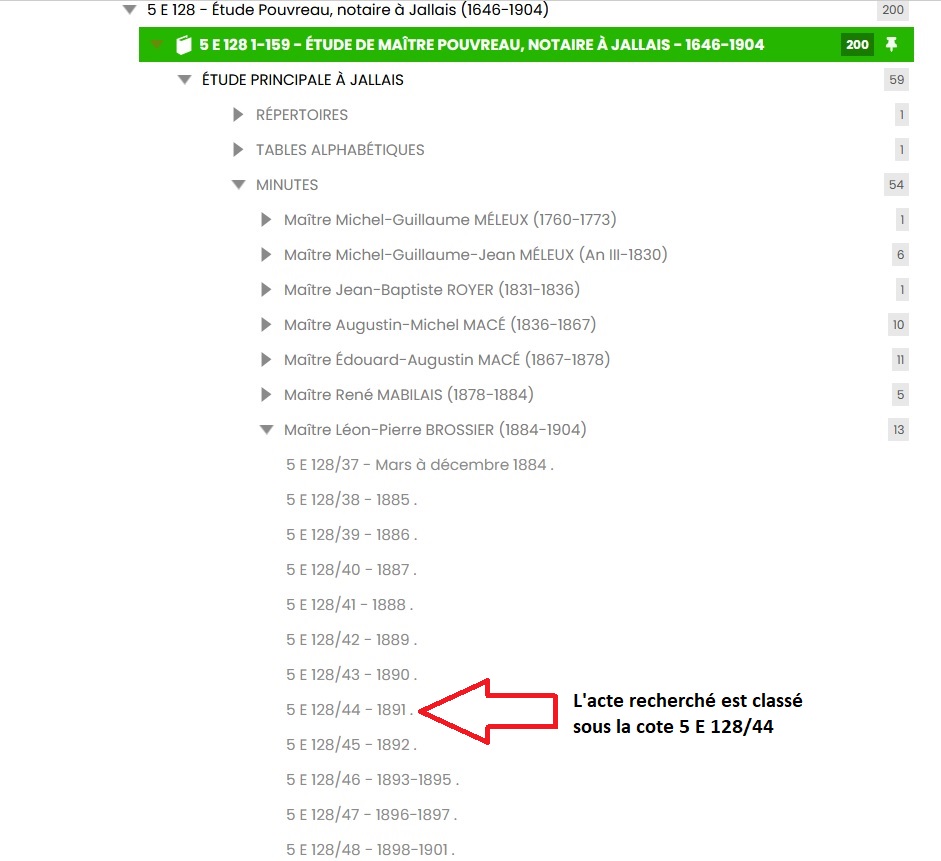 Exemple : vous recherchez un acte d’obligation (= reconnaissance de dettes) d’une valeur de 3 000 francs établi entre Mme Éléonore Bellot et M. René Bâtardière, résidant tous les deux à Jallais, vers la fin du XIXe siècle ou au tout début du XXe siècle (date incertaine).
