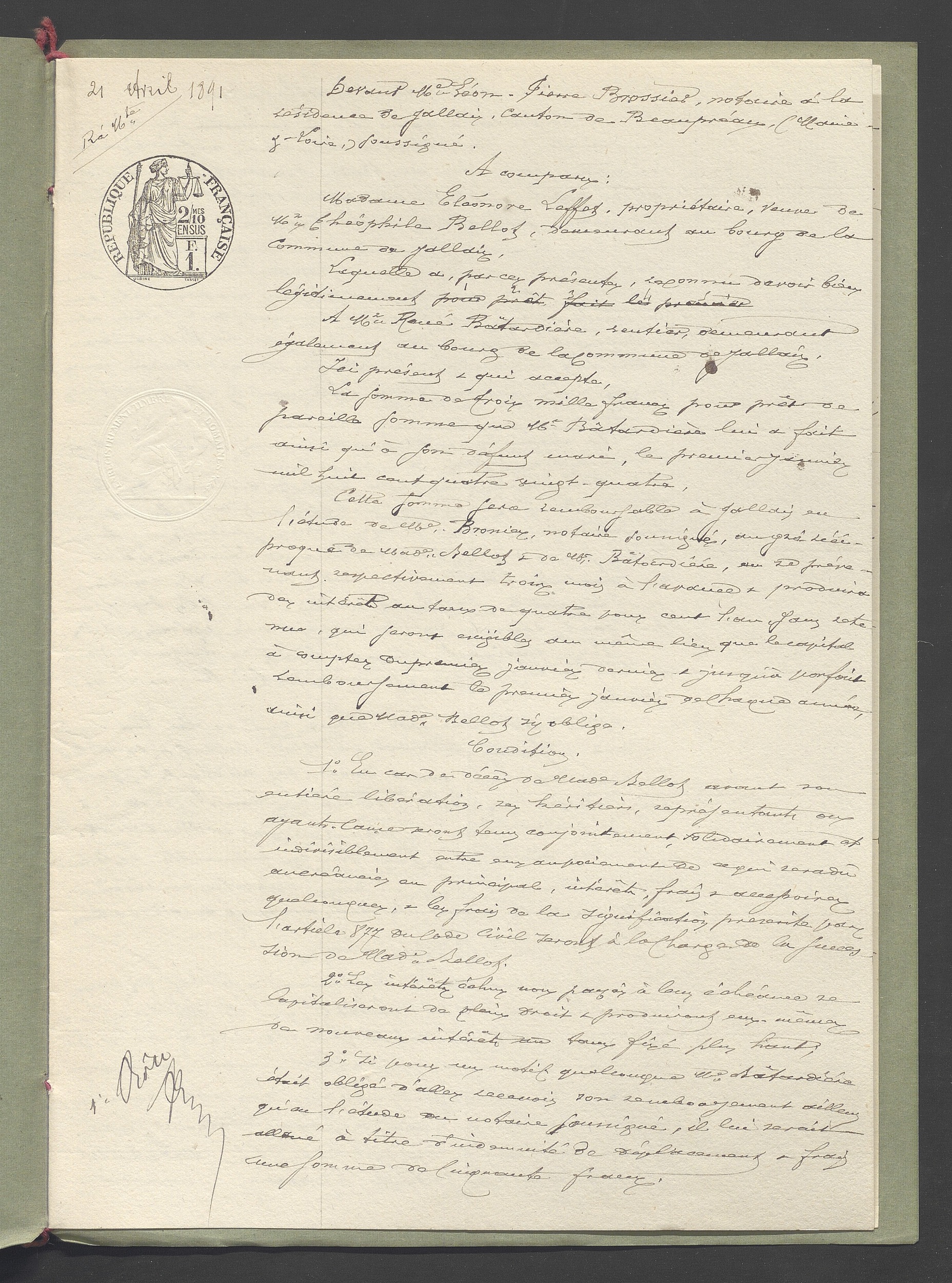 L’acte recherché a été dressé par Me Brossier et enregistré le 22 avril 1891.