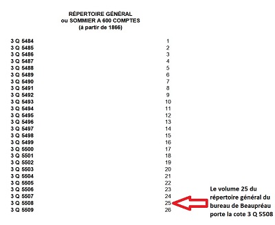 Dans cet exemple, le document recherché date de la fin du XIXe ou du début du XXe siècle. Pour trouver le nom du notaire et sa date précise, il convient donc de consulter en premier lieu le répertoire général, dans la sous-série 3 Q.